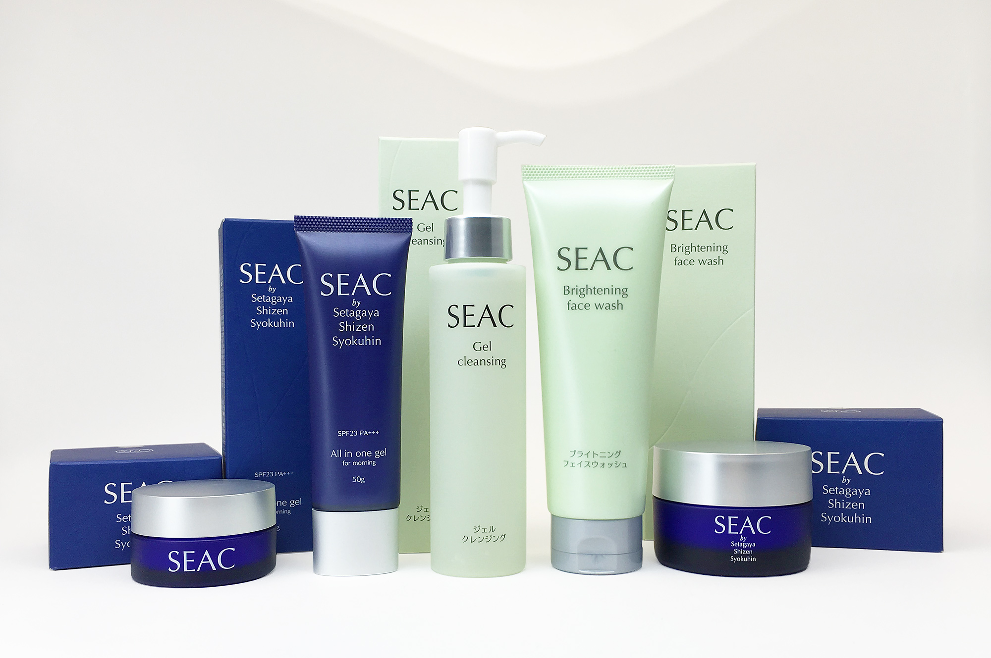 世田谷自然食品さまの化粧品ブランド「SEAC」シリーズのパッケージデザイン・ロゴデザインを担当いたしました。ブランドのリニューアルも兼ねた商品発売ということで、クライアントからのご希望をもとにブランドロゴを何パターンかを最初にご提案しました。