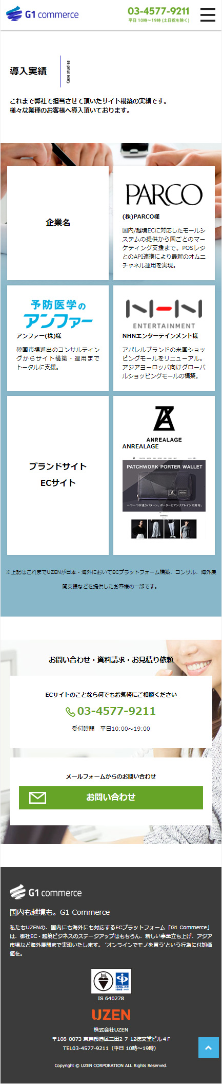 株式会社 UZENさまのご依頼で、同社が提供しているECサイト構築サービス「G1commerce」のウェブサイトリニューアルを実施いたしました。リニューアル以前は1ページのランディングページだけだったサイトを大幅に拡充し、事業規模に合わせたサイトへとゼロから構築いたしました。